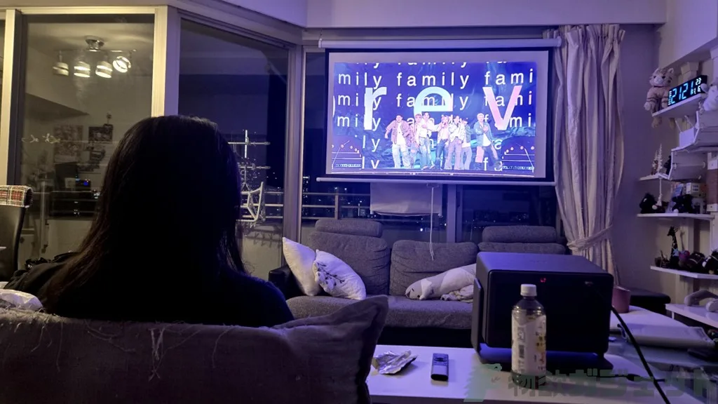 我が家では結構食卓の前の壁に映して、ここで椅子に座ってお菓子とドリンクを片手に楽しんでいます。