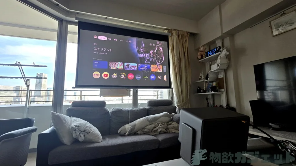 TVと全く遜色無いどころかTV以上の大画面と、12W x2のスピーカーで迫力が半端ない。