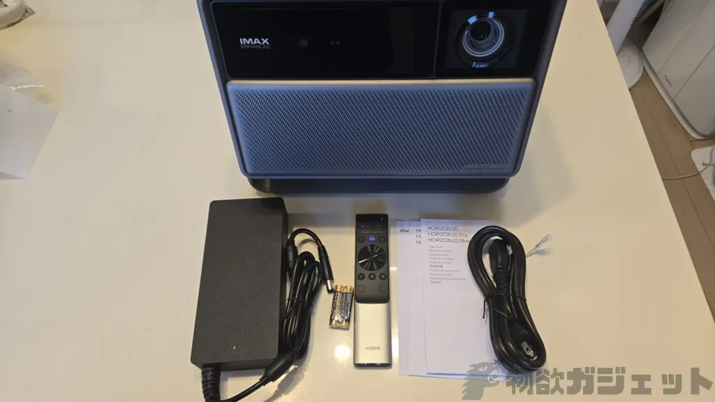 同梱物はHORIZON 20 Pro本体、ACアダプタ、リモコン、電池、マニュアルとなっています。