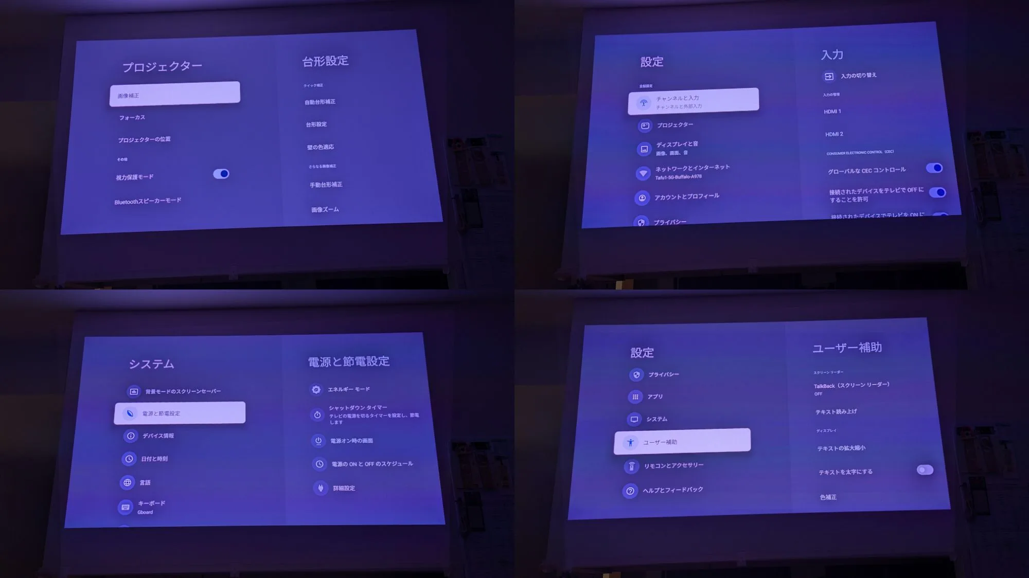 台形補正は4辺を細かく調整できますし、フォーカス、ズームといった映像関連から、Bluetoothスピーカーの接続なども設定可能。