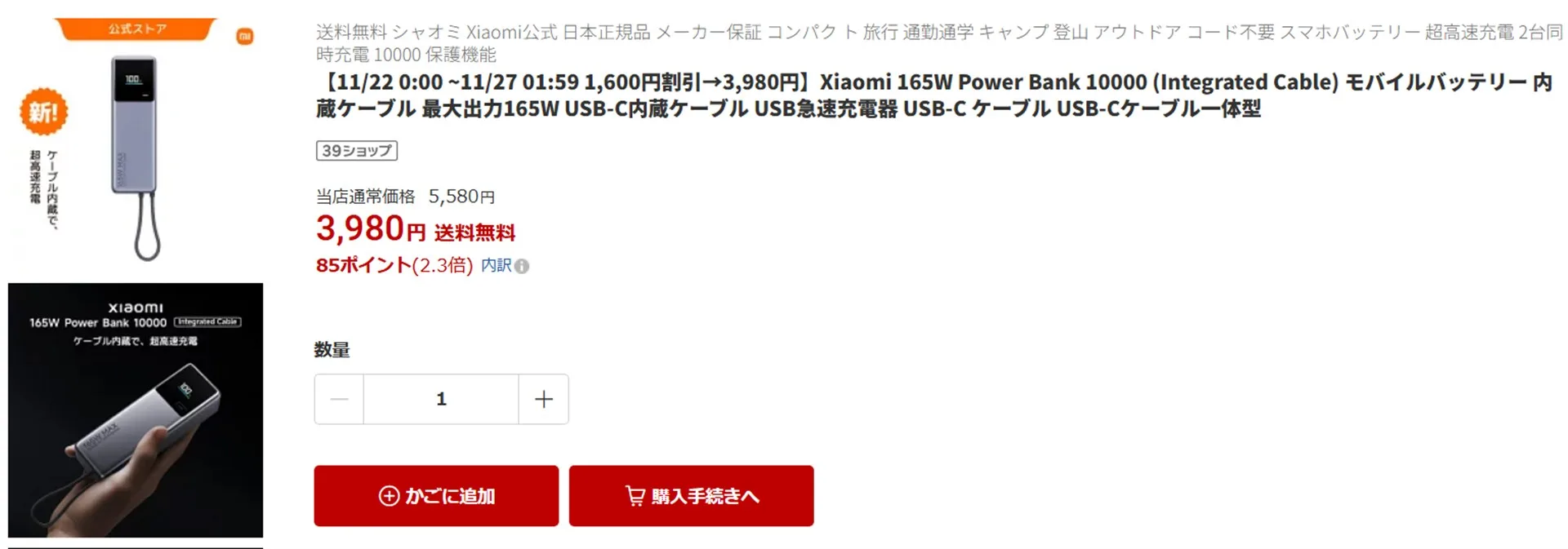Xiaomi(シャオミ)から発売されている165W急速充電対応モバイルバッテリー「Xiaomi 165W Power Bank 10000mAh」が、楽天ブラックフライデーセールにて通常より1600円オフで3,980円と超特価中。
