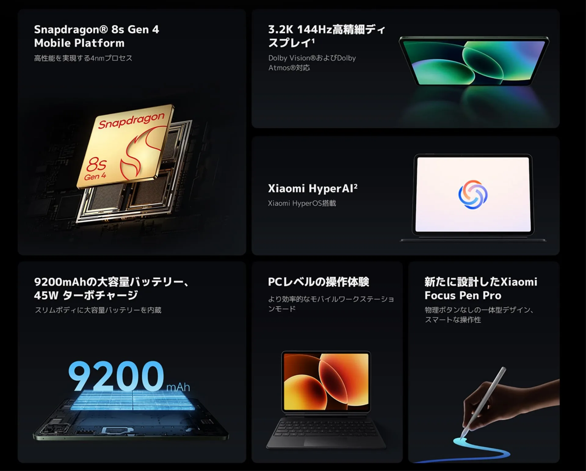 前モデルのXiaomi Pad 7から、プロセッサがSnapdragon 8s Gen 4へと大幅にアップグレードした正常進化モデルとなっています。