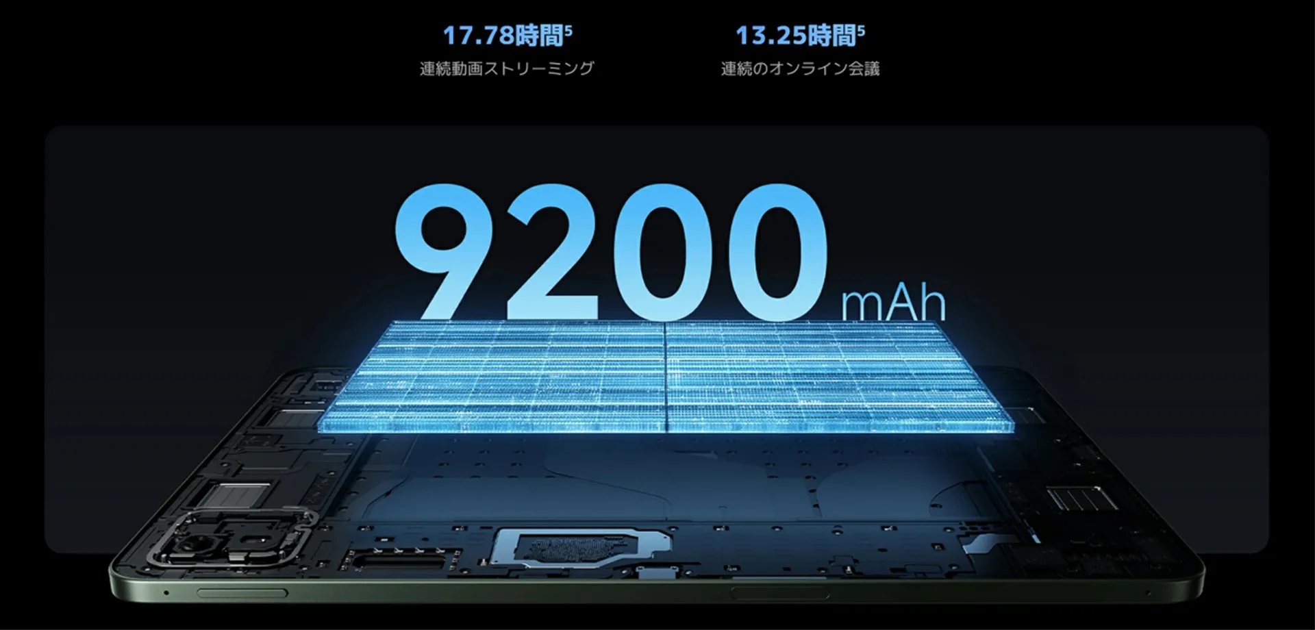 バッテリー容量は前モデルから増加し、9200mAhの大容量を搭載。 連続ストリーミング動画で17.78時間も使えるので、長旅もお供にも良いし、ゲームでのバッテリー切れの心配も少なくなります。