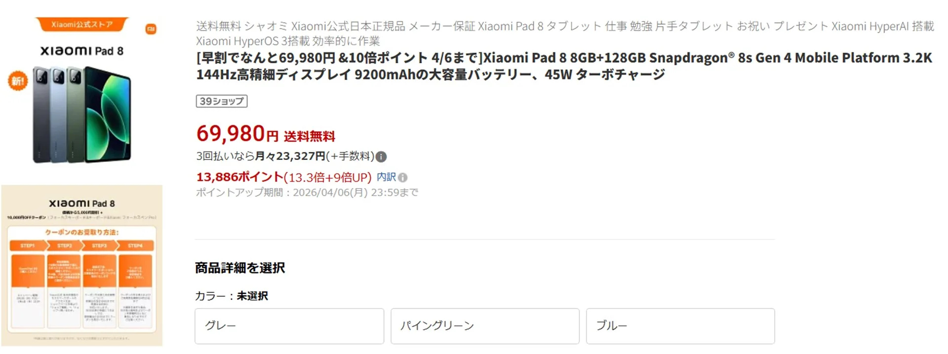 Xiaomi Pad8 : 8GB+128GB版 74,980円