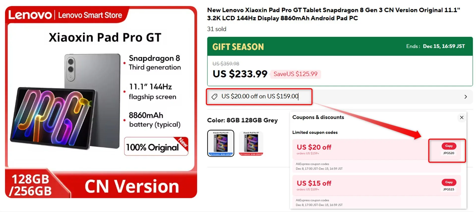 Lenovo Xiaoxin Pad Pro GT 8GB+128GBの価格は、233.99ドル。日本円で約3万6000円。