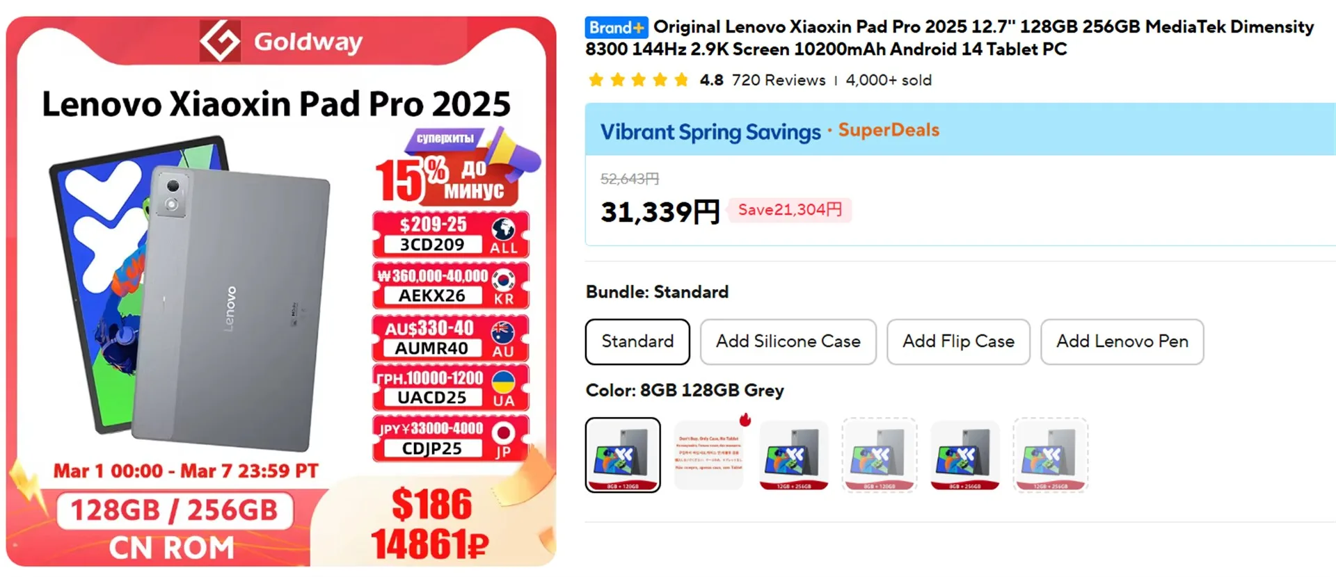 Lenovo Xiaoxin Pad Pro 2025 8GB+128GBの価格は、AliExpressセールで約31,000円。