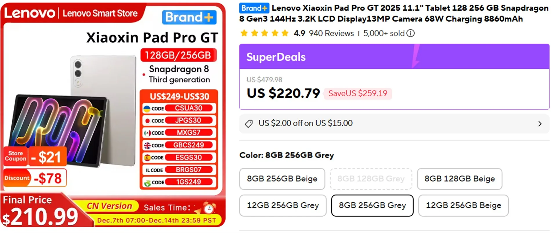 Lenovo Xiaoxin Pad Pro GT 8GB+128GBの価格は、AliExpressで220.79ドル(35,846円)。