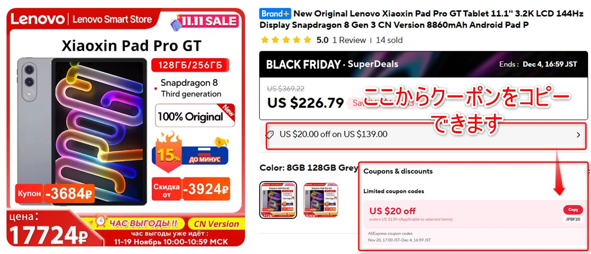 Lenovoの超人気、Snapdragon8 Gen3搭載11.1インチタブレットLenovo Xiaoxin Pad Pro GT が、AliExpressブラックフライデーセールにて、相変わらず3万円ちょいと性能を考えればバカ安いです。