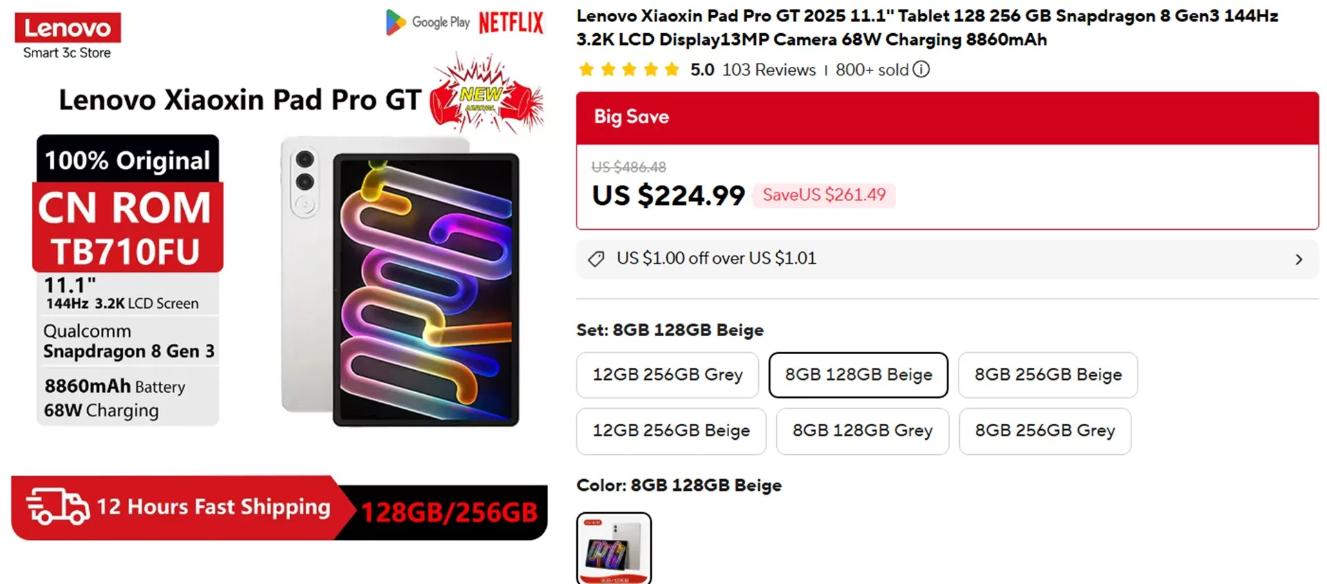 Lenovo Xiaoxin Pad Pro GT 8GB+128GBの価格は、224.99ドル。日本円で3万4973円。