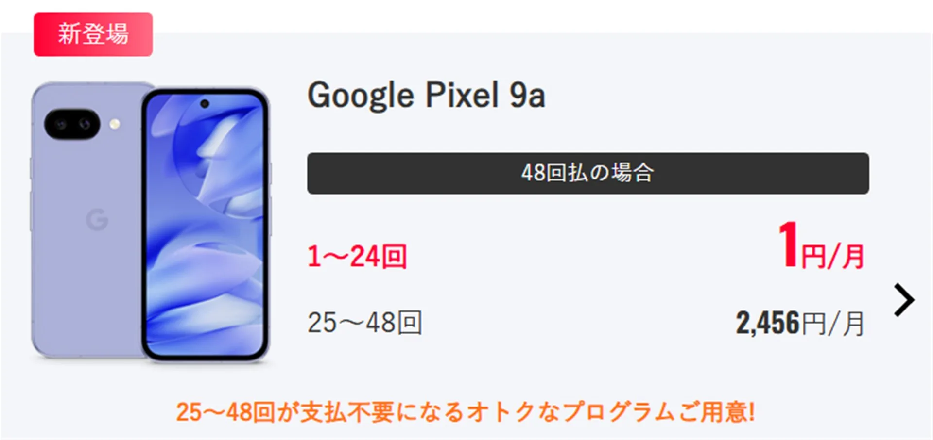 特にGoogle Pixel 9aは、2年で要返却とはいえ、1円/月で使える凄いキャンペーンです。