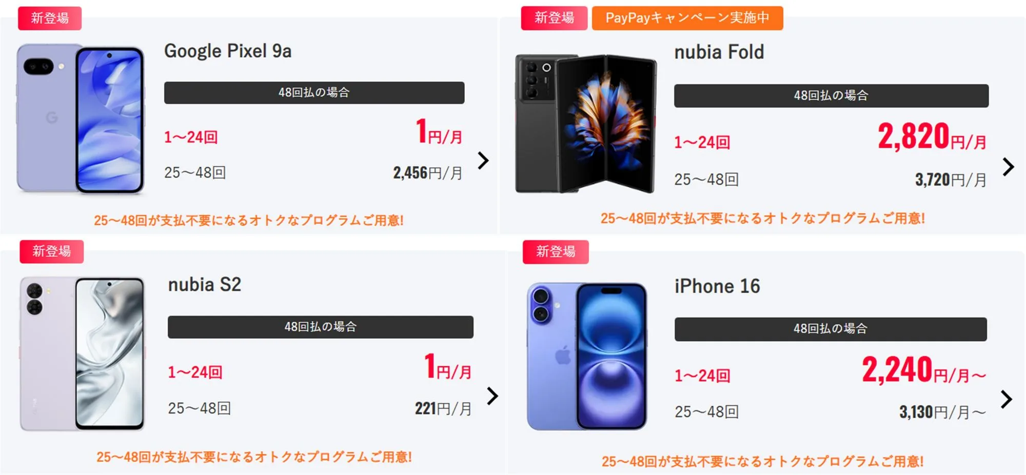 iPhone16、16e等や、Pixel 9a、発売直後のnubia Fold等の人気製品が軒並み大幅値下げとなっています。