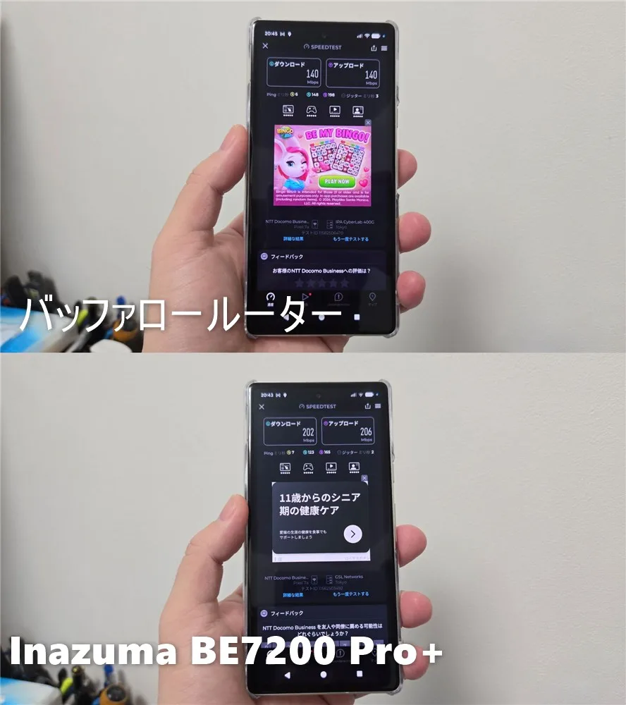 普段メッシュ組んでいてもやや遅い部屋で試しましたが、通常だと140Mbpsの部屋で、ZTE BE7200 Pro+に変更後は202Mbpsとメッシュ無しでも1.4倍から1.5倍ぐらい高速で、電波の飛びと高速さは圧倒的ですね。