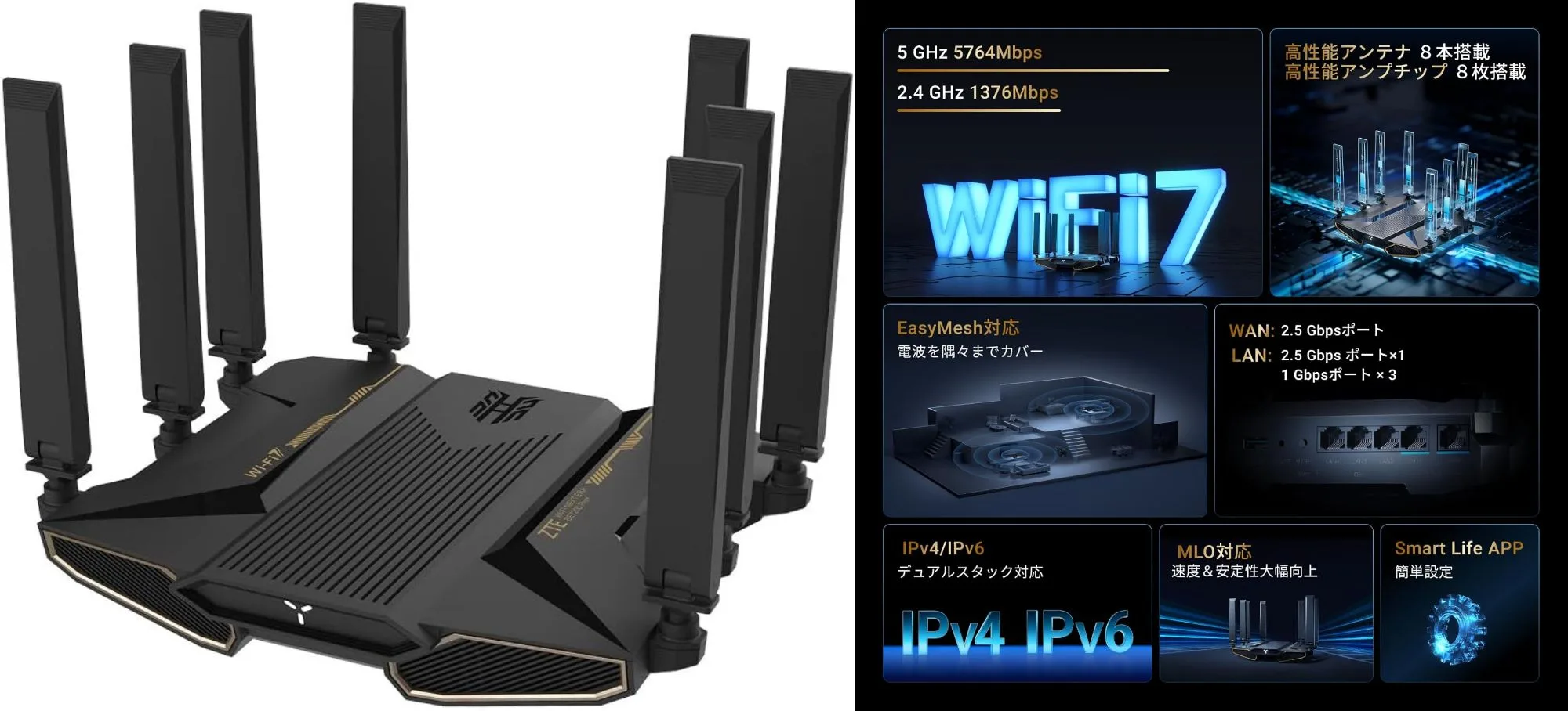 また複数の帯域を同時に利用できる「MLO(Multi-Link Operation)」や、変調技術「4096-QAM」といった技術を採用しています。