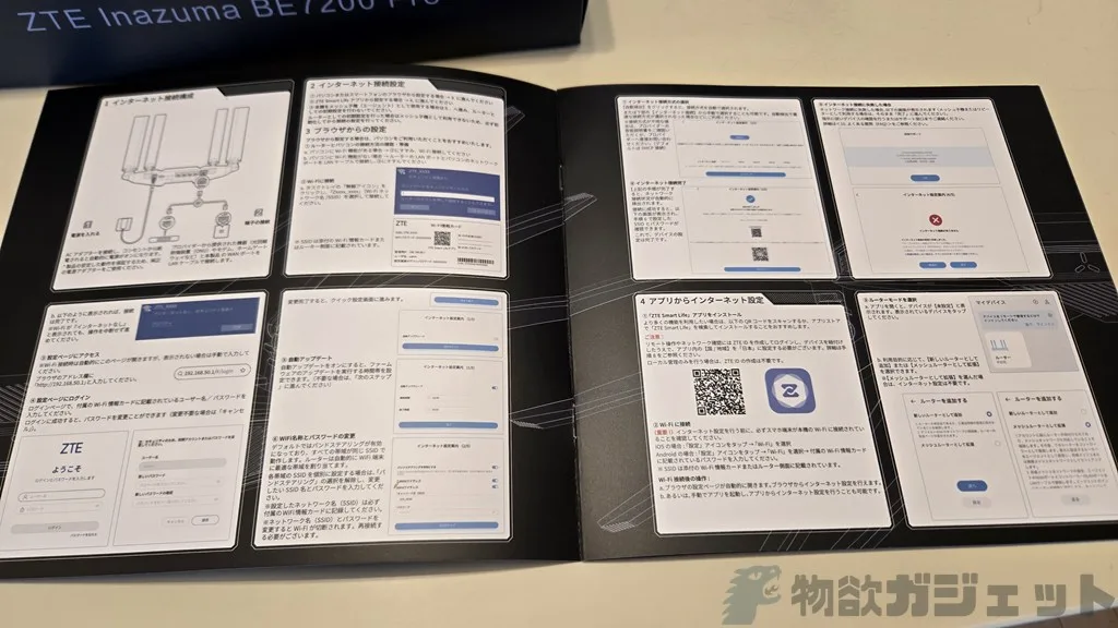 マニュアルはカラーで見やすいです。基本的にはWANポートに自宅LAN回線を挿して、あとはアプリで設定させる形という一般的なもので、それほど難しくない。