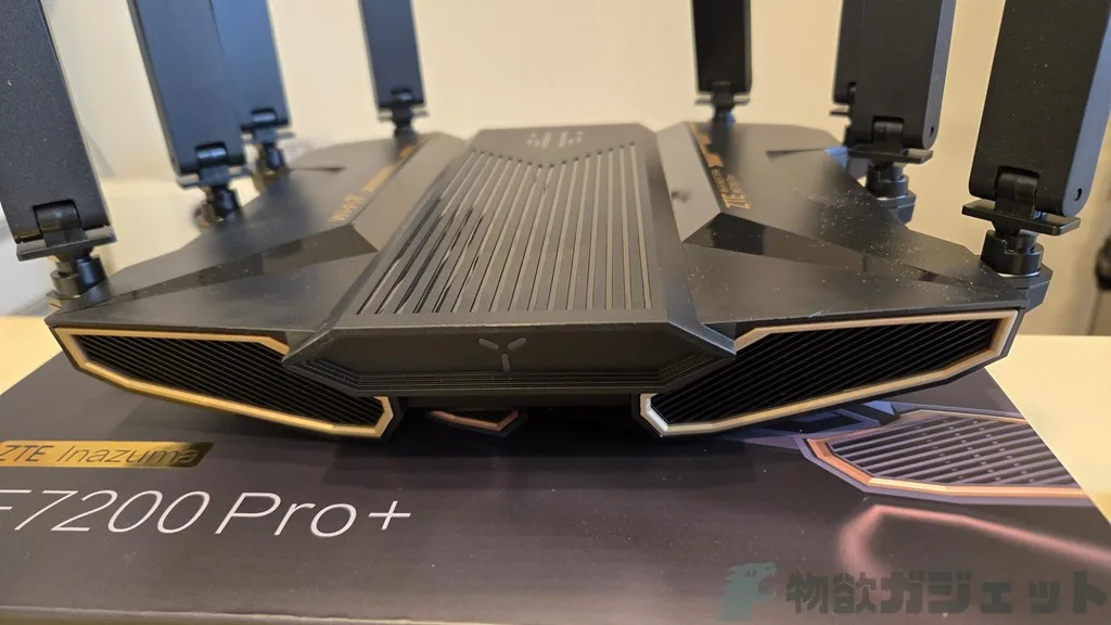 ZTE Inazuma BE7200 Pro+の前面はゲーミングっぽいデザインでいかつい。前面のインジケーターライトは設定で常時オン/オフが切り替え可能。