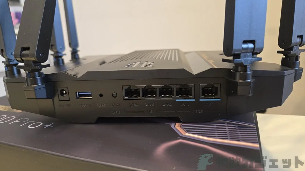 背面にはWAN/LANポートとUSBポートという構成です。WAN/LANともに青いバーがあるところは2.5Gbpsで、その他は1Gbpsとなります。この2.5Gbpsポートは独立している為、高速通信させたいデバイス(例えばゲーミングPC等)に接続していれば、他デバイスが帯域を使っても速度低下を気にせず使える有線LAN環境が可能です。