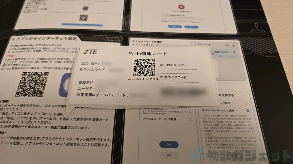 最重要はこのWiFiカードで、ここにログインパスワードや、管理用IPアドレス等が書かれているので、絶対無くしちゃだめなもの。